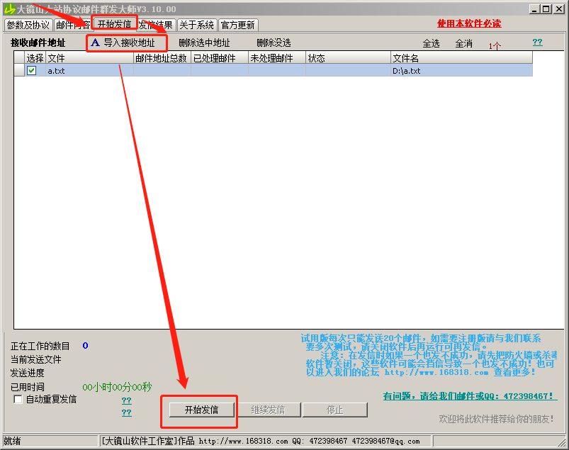 输入完邮件标题和邮件内容后,切换到“开始发信”页。点“导入接收地址”导入要发送的邮件地址,邮件地址在文件中一行一个。点“开始发信”即开始发信,如下图: