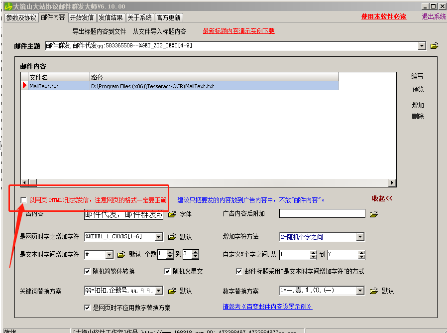 本设置示例的邮件标题为:邮件群发,邮件代发qq:583365509--%GET_ZI2_TEXT[4-9]。邮件内容为:邮件代发,邮件群发软件,实力见证,赶紧加QQ:583365509。如下图的设置:
