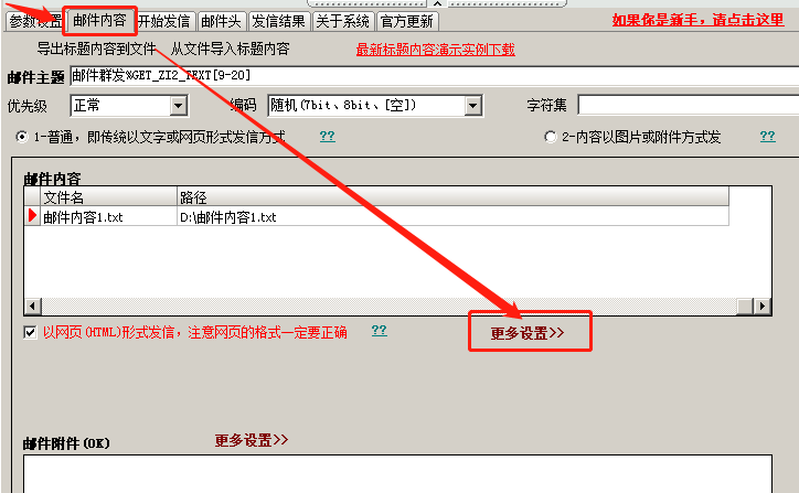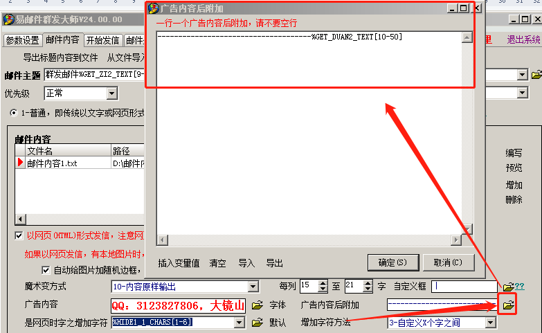 ③设置广告内容:在邮件内容设置页,点击第一个“更多设置”,然后点击广告内容旁边文件夹按钮,输入广告内容,如下图: