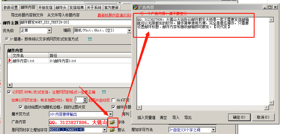 以下用词“广告内容”说明:广告内容即就是我们要发的内容。往往邮件中除了我们需要发的内容外还会有不需要的内容,称为干扰内容。如下图示: -