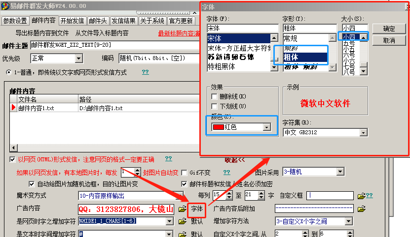 如上图的预览效果,广告内容是文字。广告内容前后都有干扰内容。文字要变红突出,必须采用网页方式。还有重要的一点,红色部分的广告内容其实也是百变的,虽然看起来没有加任何分隔符,但其实字之间用了隐藏字符。用隐藏字会也必须用网页方式。还有邮件标题也是随机加了分隔符的。