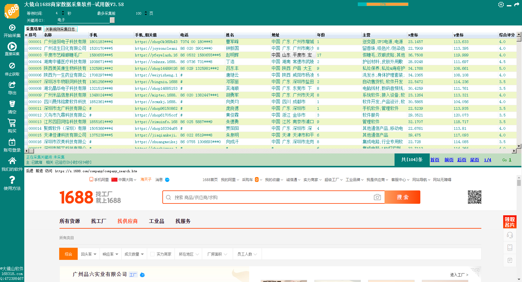 — 大镜山阿里1688商家数据采集一款采集阿里巴巴1688.com商家数据的软件,采集的数据包括店铺名称、联系人姓名、手机号码等。